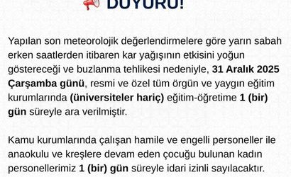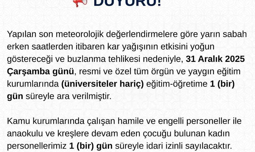 "Yapılan son meteorolojik değerlendirmelere göre yarın sabah erken saatlerden itibaren kar yağışının etkisini yoğun göstereceği ve buzlanma tehlikesi nedeniyle, 31 Aralık 2025 Çarşamba günü, resmi ve özel tüm örgün ve yaygın eğitim kurumlarında (üniversiteler hariç) eğitim-öğretime 1 gün süreyle ara verilmiştir. Kamu kurumlarında çalışan hamile ve engelli personeller ile anaokulu ve kreşlere devam eden çocuğu bulunan kadın personellerimiz 1 gün süreyle idari izinli sayılacaktır" ifadelerine yer verildi.