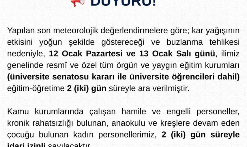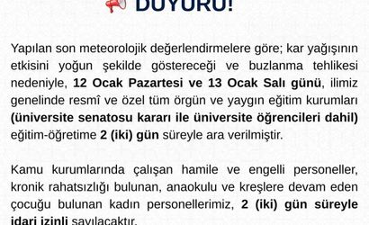 Tunceli Valiliği’nden yapılan açıklamada, "Yapılan son meteorolojik değerlendirmelere göre kar yağışının etkisini yoğun şekilde göstereceği ve buzlanma tehlikesi nedeniyle 12 Ocak Pazartesi ve 13 Ocak Salı günü, ilimiz genelinde resmi ve özel tüm örgün ve yaygın eğitim kurumları (üniversite senatosu kararı ile üniversite öğrencileri dahil) eğitim-öğretime 2 gün süreyle ara verilmiştir. Kamu kurumlarında çalışan hamile ve engelli personeller, kronik rahatsızlığı bulunan, anaokulu ve kreşlere devam eden çocuğu bulunan kadın personellerimiz, 2 gün süreyle idari izinli sayılacaktır" denildi.