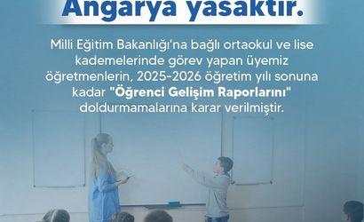 TÜRK EĞİTİM SENDİKASI TARAFINDAN YAPILAN AÇIKLAMADA, "ANGARYA İŞ YÜKÜNÜN KALDIRILMASI, HUKUKA AYKIRI UYGULAMANIN SONLANDIRILMASI AMACIYLA; MİLLİ EĞİTİM BAKANLIĞI'NA BAĞLI ORTAOKUL VE LİSE KADEMELERİNDE GÖREV YAPAN ÜYEMİZ ÖĞRETMENLERİN, 2025-2026 ÖĞRETİM YILI SONUNA KADAR ‘ÖĞRENCİ GELİŞİM RAPORLARINI’ DOLDURMAMALARINA KARAR VERİLMİŞTİR" DENİLDİ.