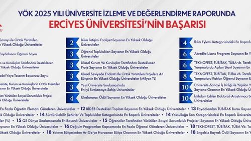 YÖK'ün 67 göstergeli 'Üniversite İzleme ve Değerlendirme Genel Raporu-2025'ine göre Erciyes Üniversitesi birçok kategoride ilk 20'de yer aldı.