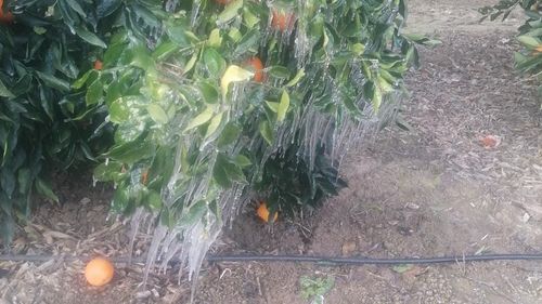 Adana'da meteorolojinin uyarısına rağmen gece etkili olan don nedeniyle Yüreğir’in Havutlu Mahallesi'ndeki bazı portakal ağaçları buz tuttu, bahçelerde zarar oluştu.