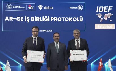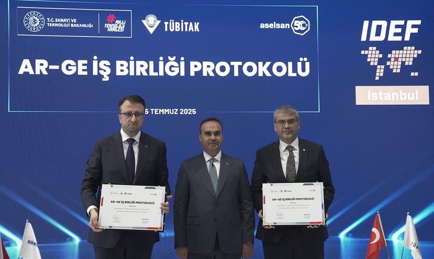 Anadolu Ajansının (AA) 'Global İletişim Ortağı' olduğu 17. Uluslararası Savunma Sanayii Fuarı (IDEF 2025) kapsamında, Aselsan ile TÜBİTAK arasında Ar-Ge İş Birliği Protokolü imzalandı. Sanayi ve Teknoloji Bakanı Mehmet Fatih Kacır (sağ 2), Milli Savunma Bakanı Yaşar Güler (ortada), Ticaret Bakanı Ömer Bolat'ın (sol 2) katılımıyla gerçekleşen protokole taraflar adına ASELSAN Genel Müdürü Ahmet Akyol (solda) ve TÜBİTAK Başkanı Prof. Dr. Orhan Aydın (sağda) imza attı.