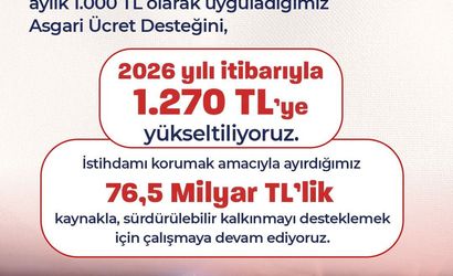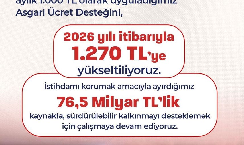 Paylaşımında "Güçlü destek, güçlü istihdam. İstihdamı destekleyecek politikalarımızı kararlılıkla sürdürüyoruz. Asgari Ücret Desteğini, 2026 yılı itibarıyla bin 270 liraya yükseltmiştik. Önümüzdeki yıl toplam 76.5 milyar liralık kaynakla çalışma hayatımızı daha güçlü kılacak, istihdam kapasitemizi koruyacağız."