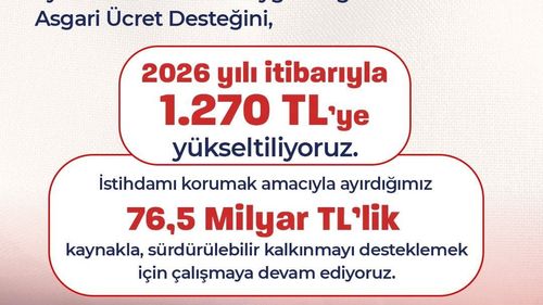 Bakan Vedat Işıkhan, Asgari Ücret Desteğinin 2026'da bin 270 liraya yükseldiğini hatırlatarak, 76.5 milyar liralık kaynakla çalışma hayatını güçlendirip istihdamı koruyacaklarını açıkladı.