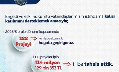 Işıkhan, sosyal medya hesabından paylaştığı mesajda, "Engelli ve eski hükümlü vatandaşlarımızın istihdamını artırmak için 2025 yılının 3’üncü döneminde 288 projeye destek olduk. Toplamda 124 milyon liradan fazla hibe desteği tahsis ettik" ifadelerini kullandı.