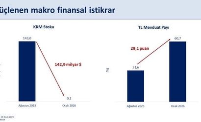 "Rezervlerimiz tarihi zirvesinde. Uyguladığımız program sayesinde brüt rezervler yaklaşık 107 milyar dolar artarak 205,2 milyar dolara ulaştı. Swap hariç net rezervlerdeki artış ise 139,3 milyar dolar oldu. Uluslararası standartlara göre rezerv yeterliliğini sağladık. Aynı zamanda, önemli bir şartlı yükümlülük olan 143 milyar dolar tutarındaki KKM’den çıkış sürecini de başarıyla tamamlıyoruz. Böylece döviz pozisyonunda toplam 280 milyar doları aşan iyileşme gerçekleşti. Güçlenen makro finansal istikrar, risk primimizin azalmasına ve ekonomimizin şoklara karşı daha dayanıklı hale gelmesine önemli katkı sağlıyor."
