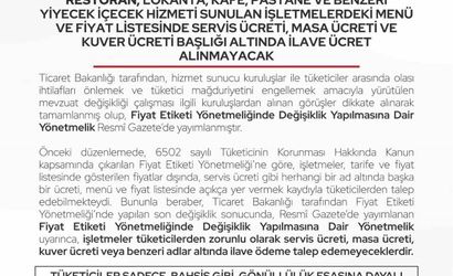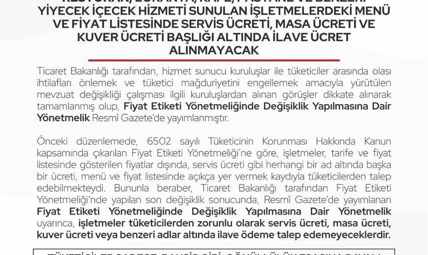 Ticaret Bakanlığı tarafından 6 bin 502 sayılı Tüketicinin Korunması Hakkında Kanun kapsamında çıkarılan Fiyat Etiketi Yönetmeliği değişikliğine dikkat çekilen açıklamada, "Restoran, lokanta, kafe, pastane ve benzeri yiyecek, içecek hizmeti sunulan işletmelerdeki menü ve fiyat listesinde servis ücreti, masa ücreti ve kuver ücreti başlığı altında ilave ücret alınmayacak" ifadesine yer verildi.