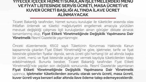 Bartın Valiliği, Fiyat Etiketi Yönetmeliği değişikliğiyle restoran ve kafelerin zorunlu servis, masa veya kuver ücreti talep edemeyeceğini bildirdi.
