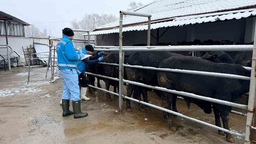 Kütahya'ya Brezilya'dan getirilen ithal besilik erkek sığırlar için kan numuneleri alınıp laboratuvar testleri, aşılama ve rutin sağlık kontrolleri titizlikle yürütülüyor.