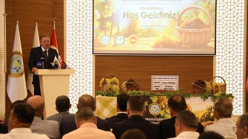 Manisa Ticaret Borsası'nda sezonun ilk çekirdeksiz kuru üzümü sembolik açık artırmayla kilogramı 3 bin 500 liradan alındı; üretici Ertan Barak 50 kilogram getirdi.