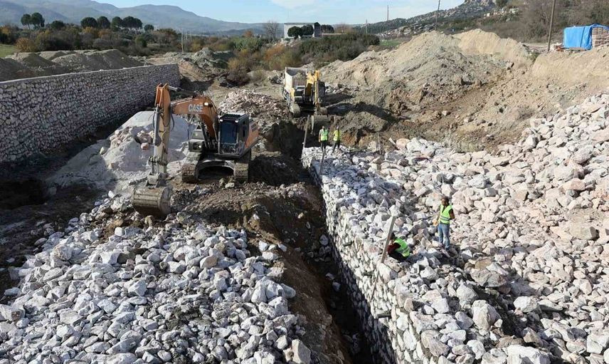 Muğla Büyükşehir Belediyesi, Yatağan’ın Hacıbayramlar Mahallesi’nde zemin çökmesi yaşanan Delice Çayı üzerinde, 29 milyon 352 bin TL’lik yatırım kapsamında taş istinat duvarı yapımına başladı.