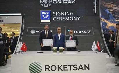 Anadolu Ajansının (AA) "Global İletişim Ortağı" olduğu, Milli Savunma Bakanlığı ev sahipliğinde, Cumhurbaşkanlığı Savunma Sanayii Başkanlığı destekleriyle, Türk Silahlı Kuvvetlerini Güçlendirme Vakfının (TSKGV) yönetim ve sorumluluğunda ve KFA Fuarcılık AŞ organizatörlüğünde İstanbul Fuar Merkezi'nde gerçekleştirilen 17. Uluslararası Savunma Sanayii Fuarı (IDEF 2025) çok sayıda protokole ev sahipliği yapmaya devam ediyor. Bu çerçevede Roketsan ve Türksat arasında gerçekleşen "Uydu Fırlatma ve Uzay Sistemleri Alanında İş Birliği Protokolü"nün imzaları, Ulaştırma ve Altyapı Bakanı Abdulkadir Uraloğlu'nun (ortada) katıldığı törende, Türksat Genel Müdürü Ahmet Hamdi Atalay (sağda) ve Roketsan Genel Müdürü Murat İkinci (solda) tarafından atıldı.