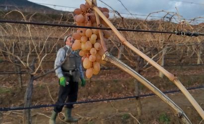 Kışın bağ budama sırasında nadiren görülen tek salkım üzümler işçiler arasında paylaşılıyor