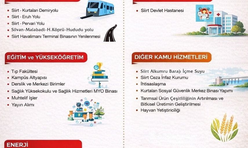 Öne çıkan yatırımlar arasında Siirt Alkumru Barajı İçme Suyu Projesi, Siirt Ceza İnfaz Kurumu ve Kurtalan Sosyal Güvenlik hizmet binası bulunuyor. Ayrıca tarımsal ürün çeşitliliğinin artırılması, bitkisel ve hayvansal üretimin desteklenmesi ile eğitim ve ihtisaslaşma alanlarına yönelik önemli girişimler programda yer alıyor.