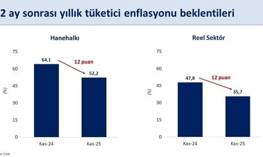 "Hanehalkı ve reel sektörün 12 ay sonrası enflasyon beklentileri kasımda geriledi. Geçen yılın aynı dönemine göre beklentiler 12 puan iyileşti. Dezenflasyon odaklı politikalarımızı kararlılıkla uygulamayı sürdürürken enflasyondaki düşüşün devamıyla birlikte beklentilerdeki iyileşmenin güçleneceğini ve fiyatlama davranışlarındaki katılığın azalacağını öngörüyoruz. Ekonomimizi fiyat istikrarının sağlandığı, verimliliğin arttığı ve refah düzeyinin yükseldiği güçlü bir yapıya kavuşturmak için gerekli adımları kararlılıkla atmaya devam edeceğiz."