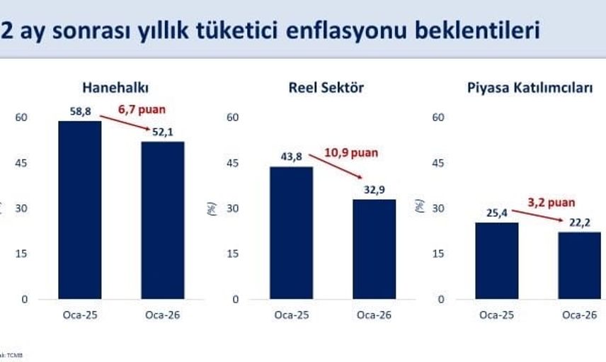 Enflasyon beklentilerindeki düşüş eğilimi sürüyor. 12 ay sonrası enflasyon beklentileri geçen yılın aynı dönemine göre hanehalkında 6,7 puan, reel sektörde 10,9 puan ve piyasa katılımcılarında 3,2 puan geriledi.