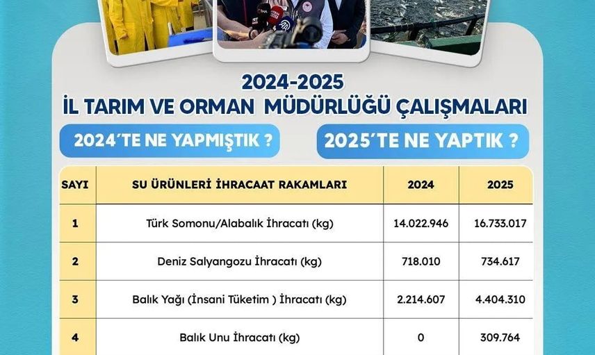 SİNOP VALİLİĞİ, İL TARIM VE ORMAN MÜDÜRLÜĞÜ’NÜN YÜRÜTTÜĞÜ ÇALIŞMALAR KAPSAMINDA 2024 VE 2025 YILLARINA AİT SU ÜRÜNLERİ VE HAYVANSAL ÜRÜN İHRACAT RAKAMLARINI KAMUOYUYLA PAYLAŞTI.