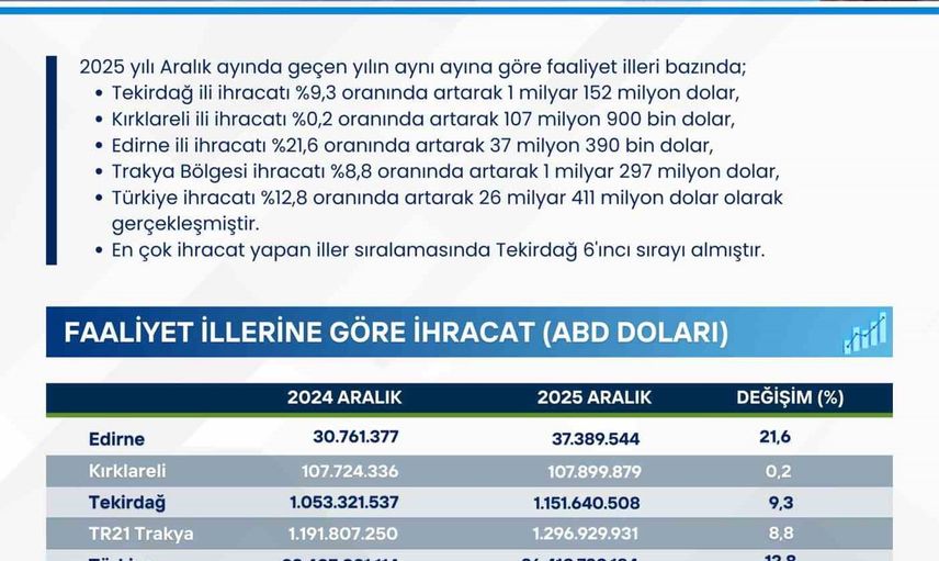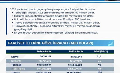 Edirne'nin ihracatı Aralık 2025'te geçen yılın aynı ayına göre yüzde 21,6 oranında artarak 37 milyon 389 bin dolar oldu. Edirne, Trakya illeri arasında en yüksek artış oranına sahip il olarak dikkat çekti.
