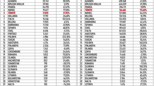 ACEA verilerine göre 2025 Ocak-Kasım döneminde Türkiye, %111,40 artışla Avrupa'nın en hızlı büyüyen elektrikli otomobil pazarı oldu; 11 ayda 164 bin 665 satış gerçekleşti.