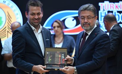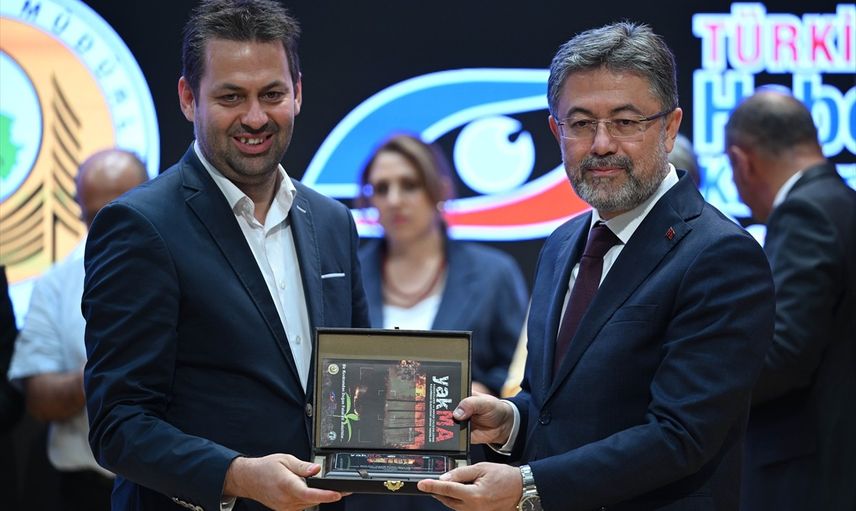 Tarım ve Orman Bakanı İbrahim Yumaklı, Türkiye Haber Kameramanları Derneği tarafından düzenlenen, habercilerin ve orman çalışanlarının kaleminden Türkiye'deki orman yangınlarını anlatan "yakMA" kitabı yazarlarına teşekkür plaket töreni ve kitap tanıtımına katıldı. Anadolu Ajansı (AA) Karadeniz Haberleri Müdür Yardımcısı Ayşe Eda Ünlü Özen (solda), Tarım ve Orman Bakanı İbrahim Yumaklı'dan (sağda) ödül aldı.