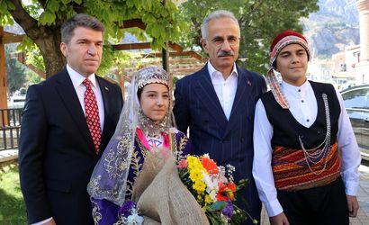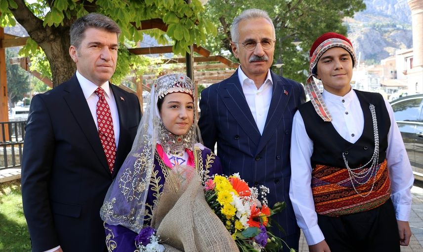 Ulaştırma ve Altyapı Bakanı Abdulkadir Uraloğlu (sağ 2), Amasya Valiliği'ni ziyaret etti. Bakan Uraloğlu, Vali Önder Bakan (solda) ve yöresel kıyafetli çocuklar tarafından çiçekle karşılandı.
