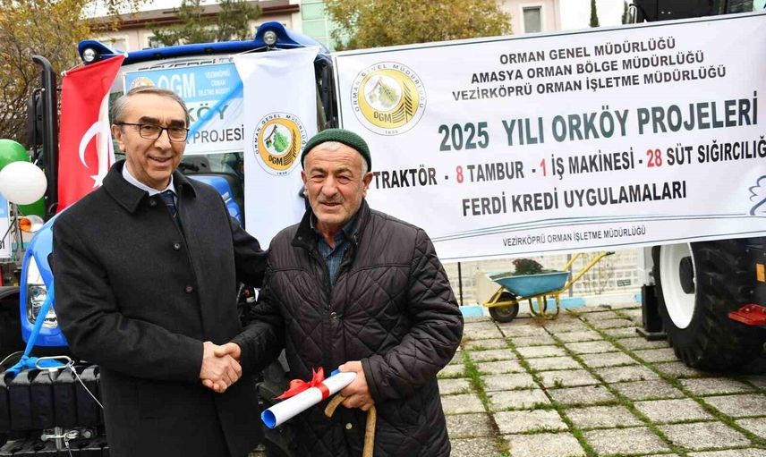 Vezirköprü Orman İşletme Müdürü Mecit Koçak yaptığı konuşmada, "ORKÖY kredili ve yüzde 20 hibeli iş makinesi, traktör, tambur ve süt sığırcılığı kapsamında 28 adet inek dağıttık" dedi.