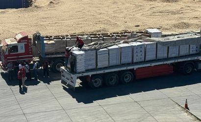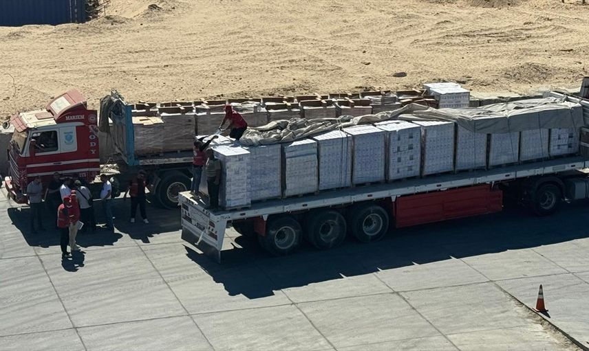 Gazze için insani yardım taşıyan 17. "İyilik Gemisi"nin El-Ariş Limanı'na ulaşmasının ardından başlatılan malzeme indirme çalışmaları devam ediyor. Bebek maması, "aç tüket gıda" ve konserve ürünlerinden oluşan yardımlar, tırlar ve forkliftler yardımıyla karaya taşınıyor.
