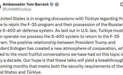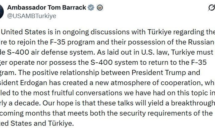 Paylaşımda Barrack, "ABD yasalarına göre, Türkiye’nin F-35 programına geri dönmesi için S-400 sistemlerini kullanmaması ve bulundurmaması gerekiyor" ifadelerini kullandı.