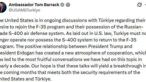 Tom Barrack, Türkiye’nin F-35 programına dönmesi için S-400’leri kullanmaması ve bulundurmaması gerektiğini belirtti; görüşmelerin dönüm noktası olmasını umuyor.