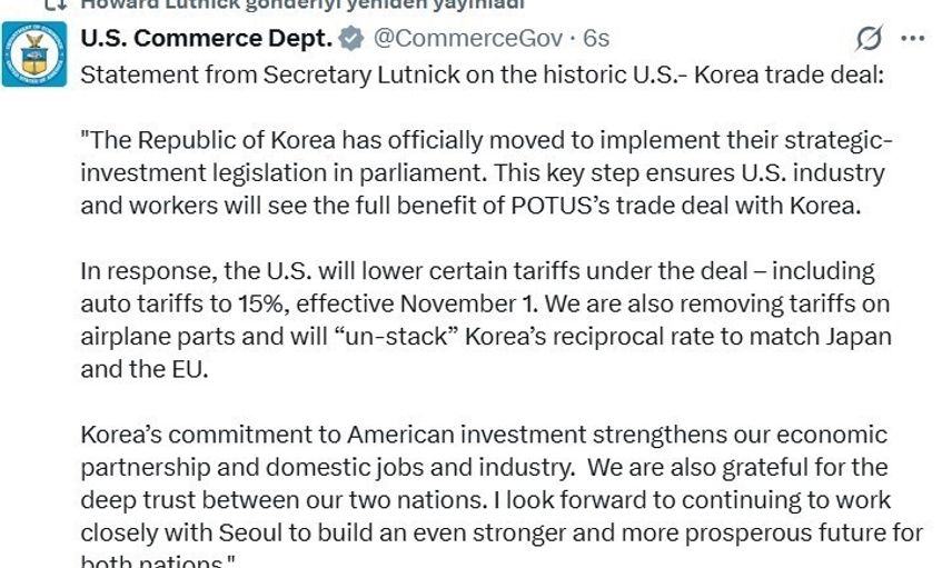 Lutnick sosyal medya paylaşımında, Güney Kore’nin stratejik yatırım yasasını parlamento aracılığıyla resmen yürürlüğe koyma adımına atıfta bulunarak, "Bu önemli adım, ABD sanayisinin ve işçilerinin, ABD Başkanı Donald Trump’ın Güney Kore ile imzaladığı ticaret anlaşmasının tüm avantajlarından yararlanmasını sağlayacak" değerlendirmesinde bulundu.