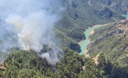 Adana'nın Kozan ilçesinde ormanlık alanda çıkan yangına havadan ve karadan müdahale ediliyor.