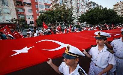 Mersin’de ise bayram coşkusu 100 metre uzunluğundaki Türk bayrağı ile yapılan yürüyüş ile taçlandırıldı. Valilik öncülüğünde, Gençlik ve Spor İl Müdürlüğü tarafından organize edilen "bayrak yürüyüşü" etkinliği, Yenişehir ilçesindeki Mersin İdman Yurdu Meydanı’ndan saat 19.19’da başladı. Protokol üyeleri, vatandaşlar ve öğrenciler, Akdeniz Bölge ve Garnizon Komutanlığının bando ekibi eşliğinde yürüyüşe katıldılar.