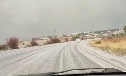 ADIYAMAN’IN KAHTA-SİNCİK YOLU ÜZERİNDE BULUNAN TÜRKİYE PETROLLERİ TESİSLERİ MEVKİİNDE ETKİLİ OLAN DOLU YAĞIŞI, YOLUN KISA SÜREDE BEYAZA BÜRÜNMESİNE NEDEN OLDU.