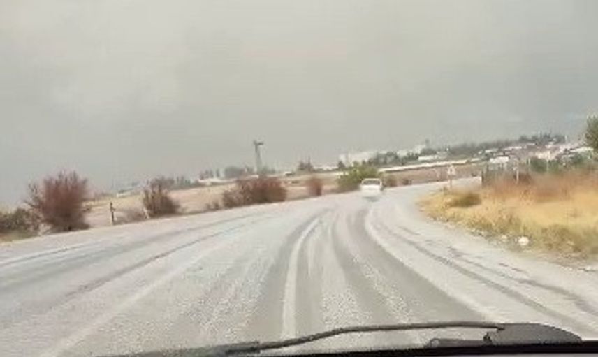 Adıyaman'ın Kahta-Sincik yolu üzerinde bulunan Türkiye Petrolleri tesisleri mevkiinde etkili olan dolu yağışı, yolun kısa sürede beyaza bürünmesine neden oldu.