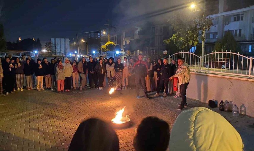 Açıklamada, "Yurtta kalan öğrenci ve personeline yönelik ’Afet Farkındalık Eğitimi, Yangın Farkındalık Eğitimi, Toplanma alanı uygulaması, Yangın uygulamaları ve Tahliye’ tatbikatı gerçekleştirildi" ifadelerine yer verildi.