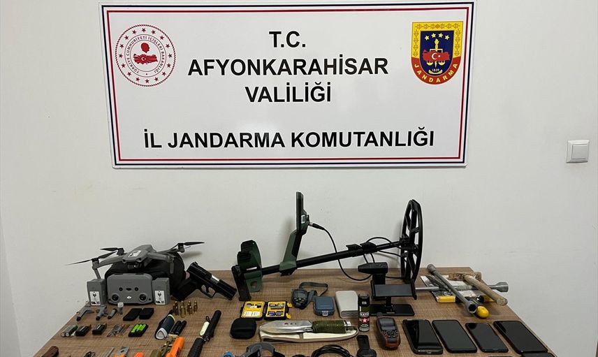 Afyonkarahisar'ın Emirdağ ilçesinde kaçak kazı yaparken yakalanan 7 kişi gözaltına alındı. Yapılan aramada, 1 çekiç, 1 hilti ucu, 1 metal alçı malası, 1 taşınabilir batarya, 2 pil, 1 turbo fan, 1 kafa feneri, 1 demir cop, 1 dedektör aparatı, 2 dedektör, 1 kürek, 2 maket bıçağı, 2 mini lazer, 3 çakı, 1 navigasyon cihazı, 1 dijital pusula, 1 su terazisi, 4 el feneri, 1 makas, 1 cep telefonu, 8 hafıza kartı, 1 multimedya kartı, 1 sim kart, 3 bluetooth USB, 1 dijital pusula, 1 kontrol kumandası, 4 dron bataryası, 1 GPS alıcısı, 1 tabanca ve 12 tabanca fişeği ele geçirildi.