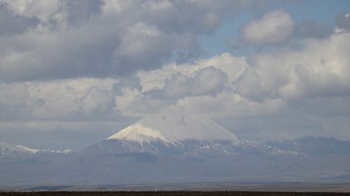 Ağrı'nın Eleşkirt ilçesindeki Kösedağ, bahar mevsiminde karla kaplandı ve muhteşem bir manzara oluşturdu.