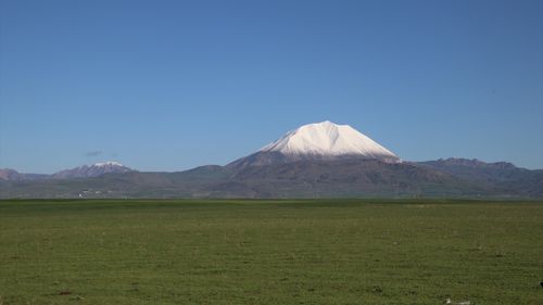 Ağrı'nın Eleşkirt ilçesindeki Kösedağ, bahar mevsiminde karla kaplanarak muhteşem manzaralar sundu.