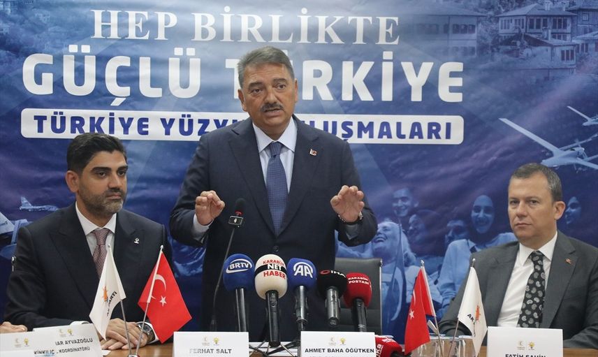 AK Parti Genel Başkan Yardımcısı Ahmet Baha Öğütken (ortada), AK Parti Karabük İl Başkanlığında düzenlenen "Türkiye Yüzyılı Buluşmaları" kapsamındaki basın toplantısında konuşma yaptı. Toplantıya, AK Parti MKYK Üyesi Fatih Şahin (sağda), AK Parti Karabük Milletvekilleri Cem Şahin ve Durmuş Ali Keskinkılıç, Karabük Belediye Başkanı Özkan Çetinkaya, AK Parti İl Başkanı Ferhat Salt (solda) ile partililer katıldı.