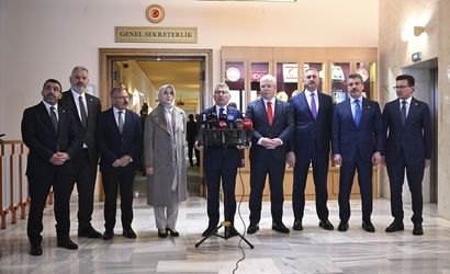AK Parti, TBMM Başkanı Numan Kurtulmuş'un Meclis Başkanı seçimi için adaylık başvurusunu TBMM Genel Sekreterliğine sundu. AK Parti Grup Başkanı Abdullah Güler (sağ 2), 28. Yasama Dönemi İkinci Devre Meclis Başkanlığı seçimi için Kurtulmuş'un aday gösterilmesine ilişkin dilekçeyi TBMM Genel Sekreteri Talip Uzun'a (sol 2) teslim etti. Abdullah Güler'e, AK Parti Grup başkanvekilleri Özlem Zengin (sağda) ve Muhammet Emin Akbaşoğlu (solda) da eşlik etti.