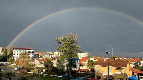 Akçakoca'da sabah saatlerinde etkili olan yağışın ardından beliren gökkuşağı, Kent Merkezi'nden cep telefonu kamerasına yansıdı ve kısa süreli görsel şölen oluşturdu.