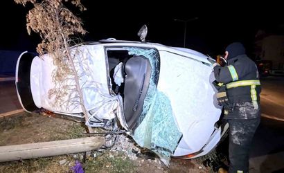 Aksaray'da refüje çıkan otomobil önce ağaca sonra direğe çarptı