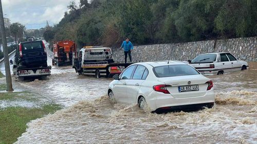 Alanya İncekum'da öğle saatlerinde etkili sağanak nedeniyle D 400 karayolunda bazı araçlar mahsur kaldı; küçük araçlar geçiş yapamıyor, trafik eski yola verildi.