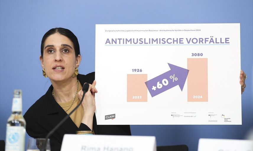 Almanya'da hazırlanan bir rapor, ülkede Müslüman karşıtı olayların sayısının 2024'te "alarm verici" yeni bir yüksek seviyeye ulaştığını ortaya koydu. Almanya'da faaliyet gösteren İslam ve Müslüman Düşmanlığı Karşıtı İttifakının (CLAIM) hazırladığı rapora göre, ülkede 2024'te Müslüman karşıtı 3 bin 80 vaka kaydedildi. CLAIM yöneticisi Rima Hanano (sol 2), raporun tanıtıldığı basın toplantısında açıklamalarda bulundu.
