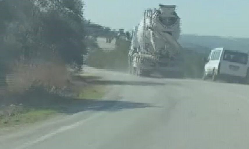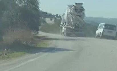 Hatay'ın Altınözü ilçesinde tek şeritli yolda 100 kilometreyi bulan hızla ilerleyen bir mikser, başka bir araç sürücüsü tarafından kayda alındı.