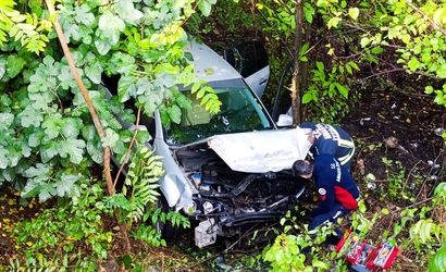 Amasya'da meydana gelen kazada, bahçeye devrilen otomobilde 4 kişi yaralandı.