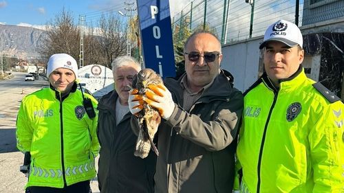 Amasya-Tokat karayolunda polis ekipleri yaralı bir kızıl şahini bulup Doğa Koruma ve Milli Parklar Şubesi'ne teslim etti; kuş tedavi sonrası doğaya salınacak.