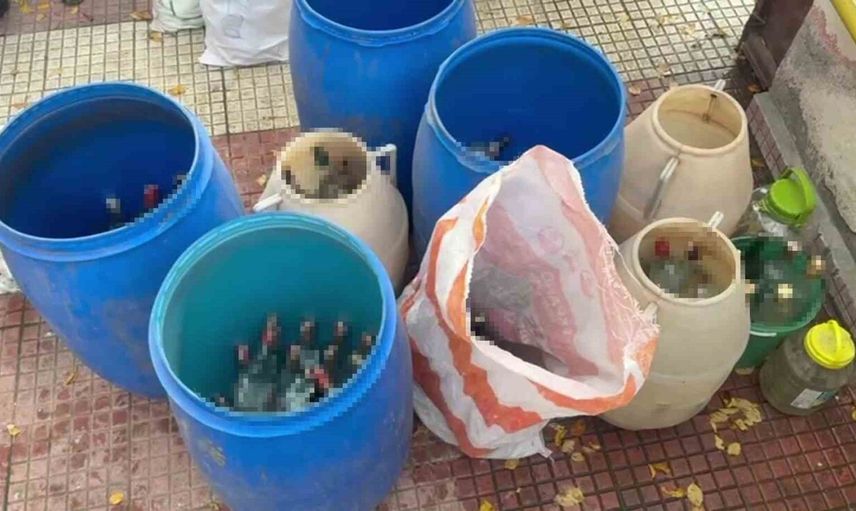 Şüphelilerin ikametlerinde yapılan aramalarda 550 adet şişelenmiş mükerrer bandrollü kaçak alkol, 35 adet 0,5 litrelik pet şişede kaçak alkol ve 30 adet 5 litrelik bidonda kaçak alkol ele geçirildi.