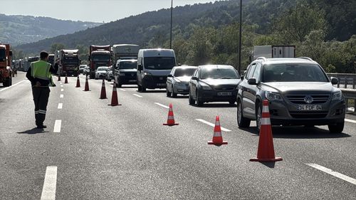 Anadolu Otoyolu'nda meydana gelen tır kazası nedeniyle uzun araç kuyruğu oluştu, ulaşım tek şeritten sağlandı.