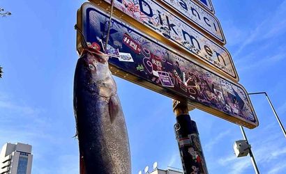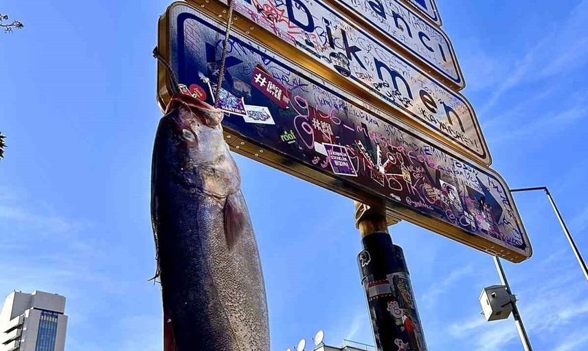 AKYA BALIĞINI TABELA ÜZERİNE ASARAK POZ VEREN BALIKÇI KARDEŞLER, ‘AKIMA SON NOKTAYI KOYUYORUZ' DİYEREK VATANDAŞLARIN İLGİSİNİ TOPLADI.